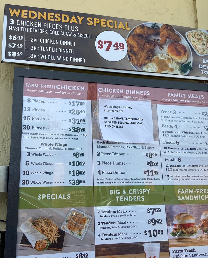 All Tender dinners come with sides and biscuit. Choice of sauce is available.